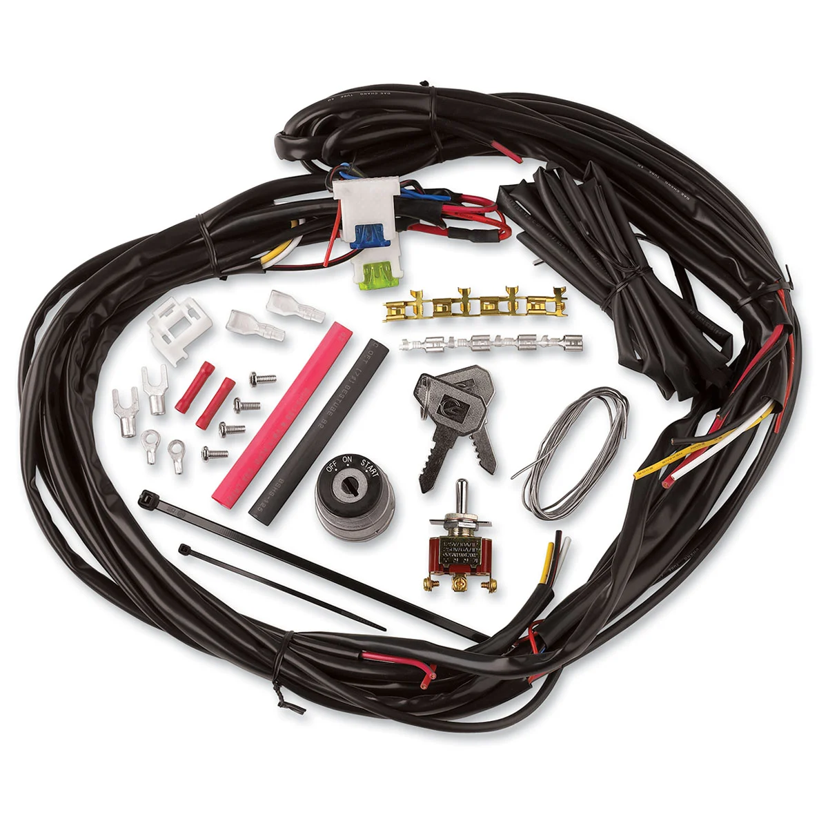 • Includes just the essentials: keyed on-off start switch, 3-way toggle switch, in-line fuses (15 and 30 amp), wire ends, shrink tube and wiring diagram