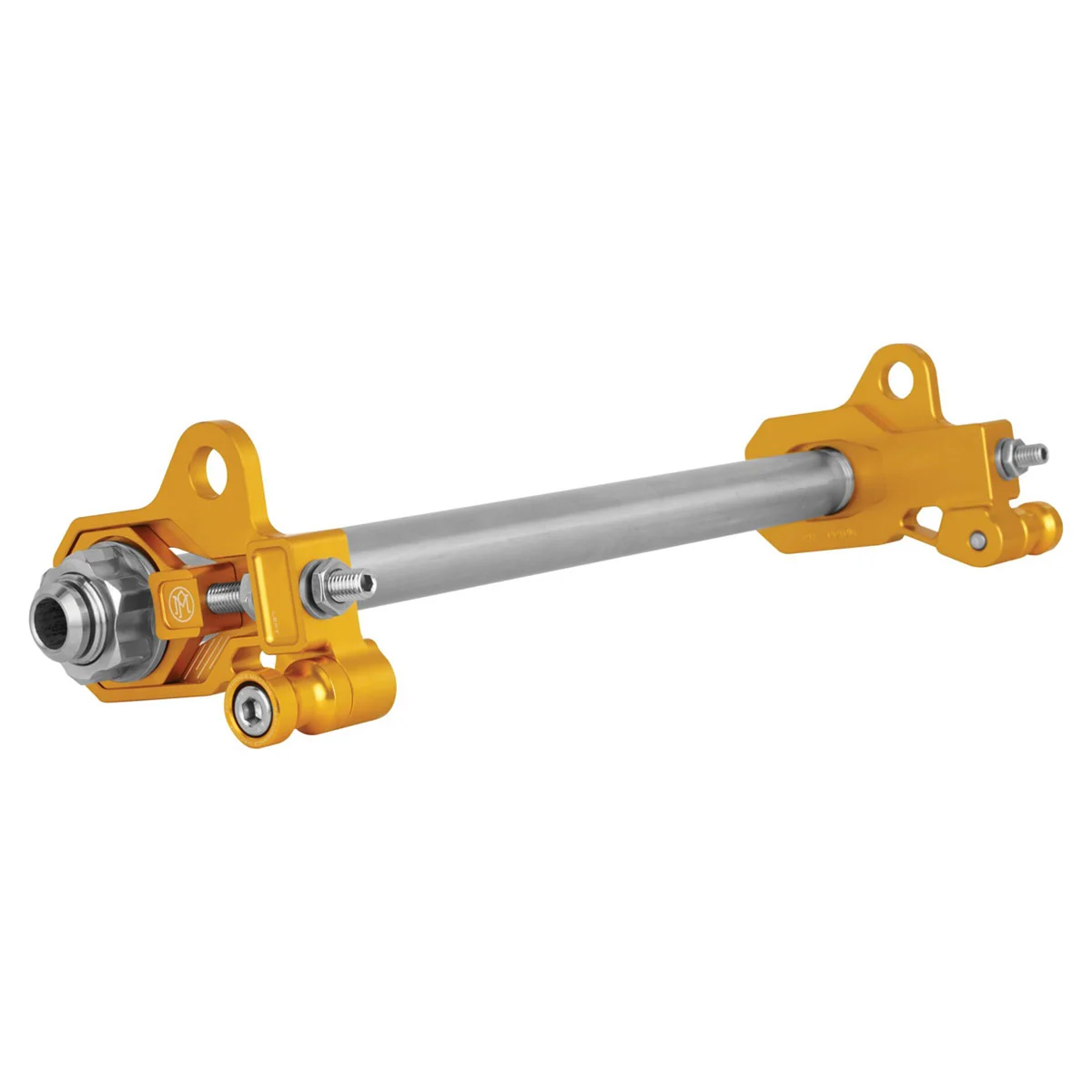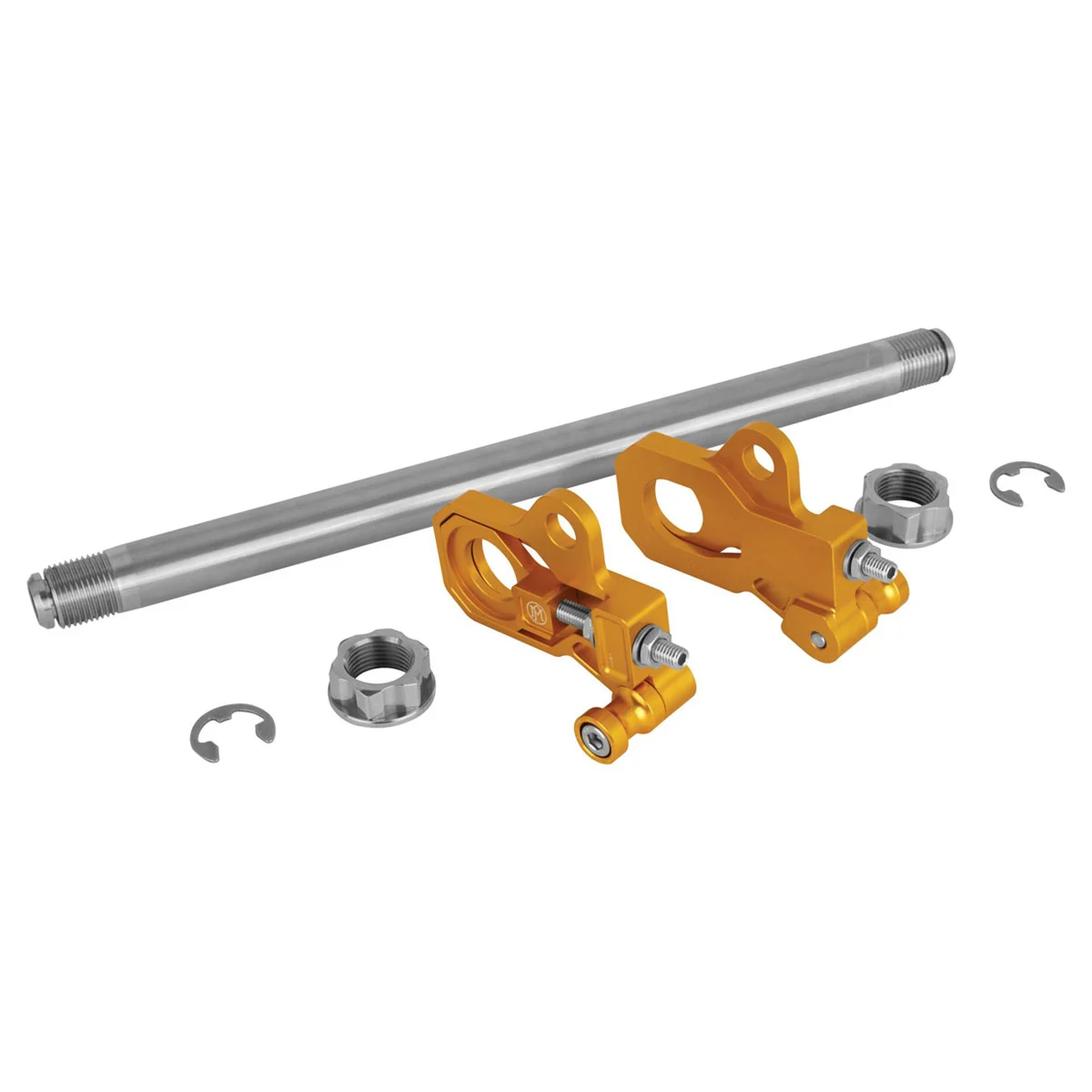 • Kit includes rear axle, adjustor mounts, sliders, axle nut, safety e-clips, upper and lower shock mount bolts and spacers