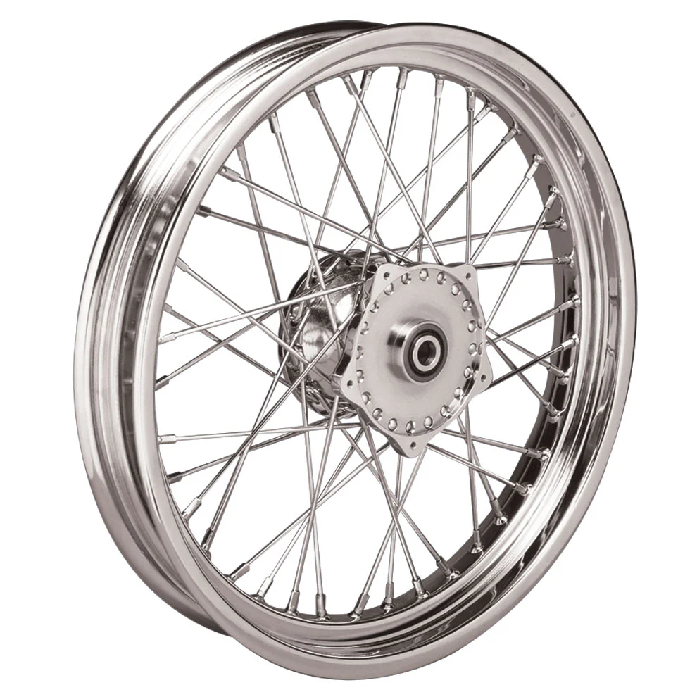 • Chrome spokes laced to a chrome hub and a 19″ drop center rim with rolled edge