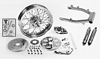 • All kits include chrome swing arm with pivot pin and bearing kit; chrome caliper and bracket, caliper anchor arm; 11-1/2″ zinc-plated drilled steel rotor; 16″ x 3″ complete chrome wheel; 51-tooth chrome sprocket; 12″ FX (spring) shock set with shock studs; and chrome axle assembly